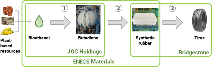 ENEOS Materials is working with Bridgestone Corporation and JGC Holdings Corporation to strengthen collaboration toward commercializing tires made from plant-based synthetic rubber in the early 2030s. This initiative is expected to improve the sustainability of raw materials for tires and contribute to ensuring a stable supply of butadiene in the future.