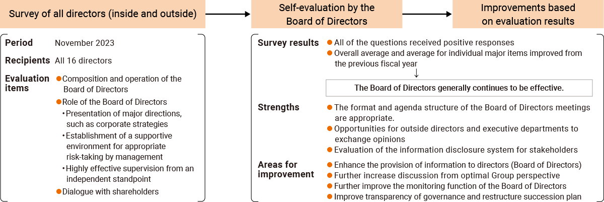 In November 2023, the Board of Directors surveyed all directors, including outside directors, to evaluate the Board’s effectiveness in fiscal 2023. In addition, in fiscal 2022 we engaged a third-party organization to update the survey questions to ensure the objectivity and transparency of the evaluations. The same survey questions were used in fiscal 2023 to identify any ongoing issues and the status of improvements. The results of the evaluation and analysis were reported at the Board of Directors meeting on March 27, 2024.