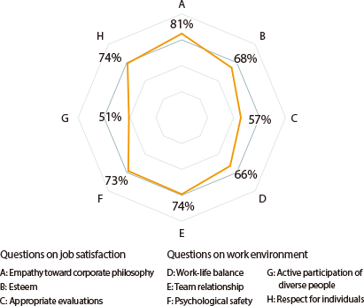 In fiscal 2024, we conducted the survey at the Company and principal operating companies. In the survey, approximately 80% of employees responded that they empathize with our corporate philosophy, confirming that our corporate vision is well understood. Over 70% of employees gave positive responses regarding psychological safety and respect for individuals. However, only around 50% of employees responded positively to questions about the active participation of diverse people and appropriate evaluations, and these two points remain issues. We will implement solutions and continue conducting the survey, expanding the scope to Group companies.