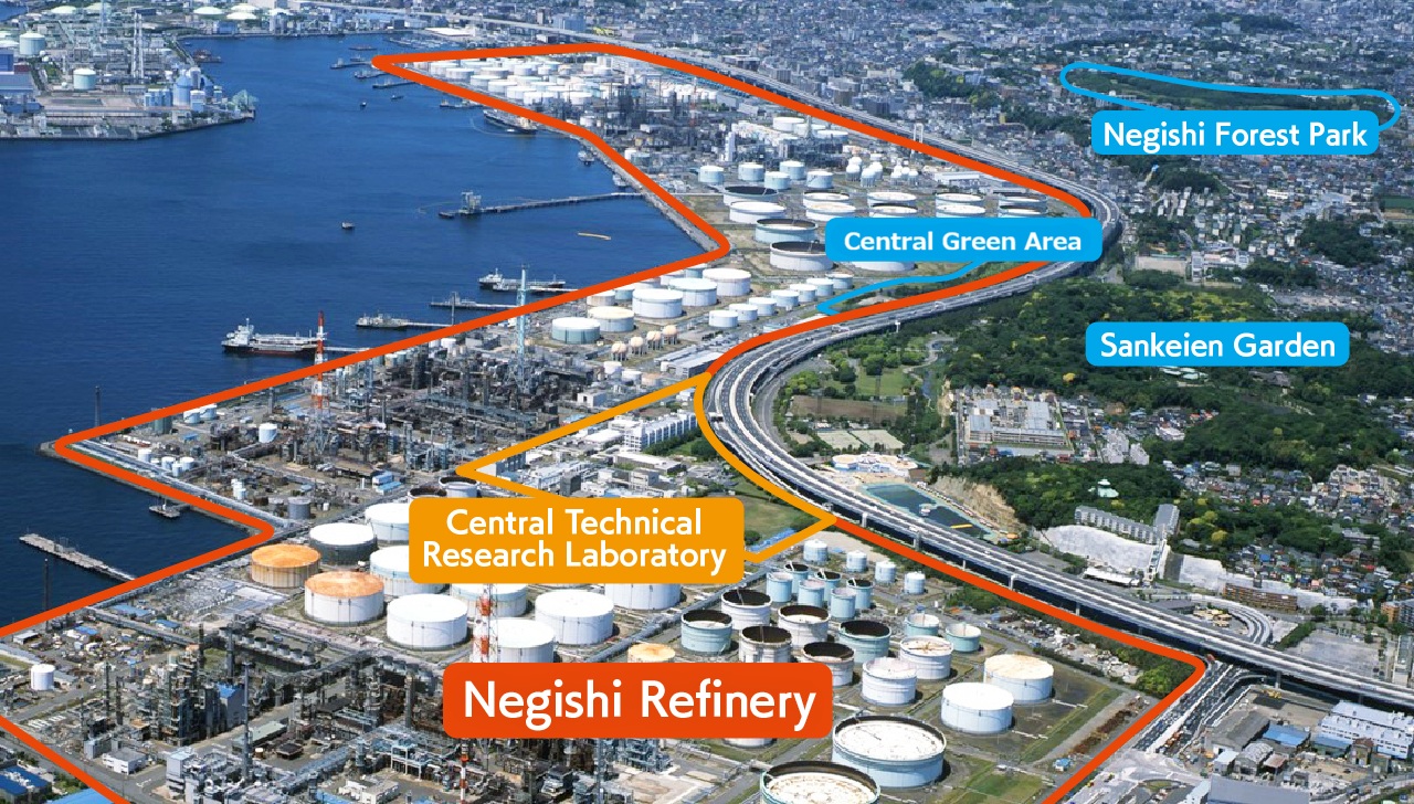 Located in Yokohama City, the Negishi Refinery has vast premises spanning approximately 2.2 million square meters (around 308 times the size of a standard soccer field). Within this vast premises lies a central green area of 60,000 square meters with three ponds. This area has been developed and sustained as a satoyama-a traditional Japanese landscape that harmonizes nature and human activity-spread among the premises facing Tokyo Bay. It is also adjacent to local green areas such as Sankeien Garden—a famous Japanese garden—and Negishi Forest Park.