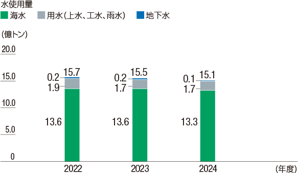 2024年度の水の使用量は15.1億トンでした。また、排水量は13.7億トンでした。