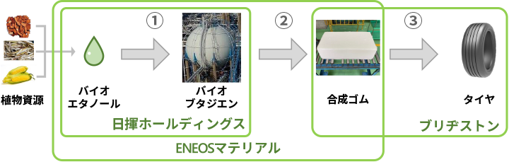 ENEOSマテリアルでは、(株)ブリヂストンおよび日揮ホールディングス(株)と協働し、植物資源由来の合成ゴムを使用したタイヤの2030年代前半の商業化に向けた連携を強化しています。この取り組みによりタイヤ原材料のサステナビリティ向上や、将来的なブタジエンの安定確保への貢献が期待できます。
