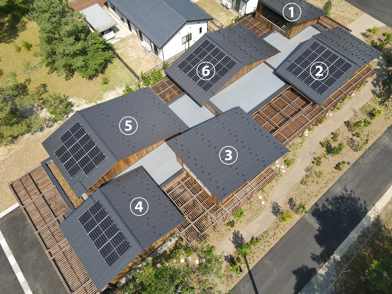 NOiLは、周囲の環境に配慮し、森の中に溶け込むよう、「パビリオン棟」「ミーティング棟」「サービス棟」「ソロワーク棟」「マルチファンクション棟」「ワークショップ棟」の木造建築6棟で構成されています。