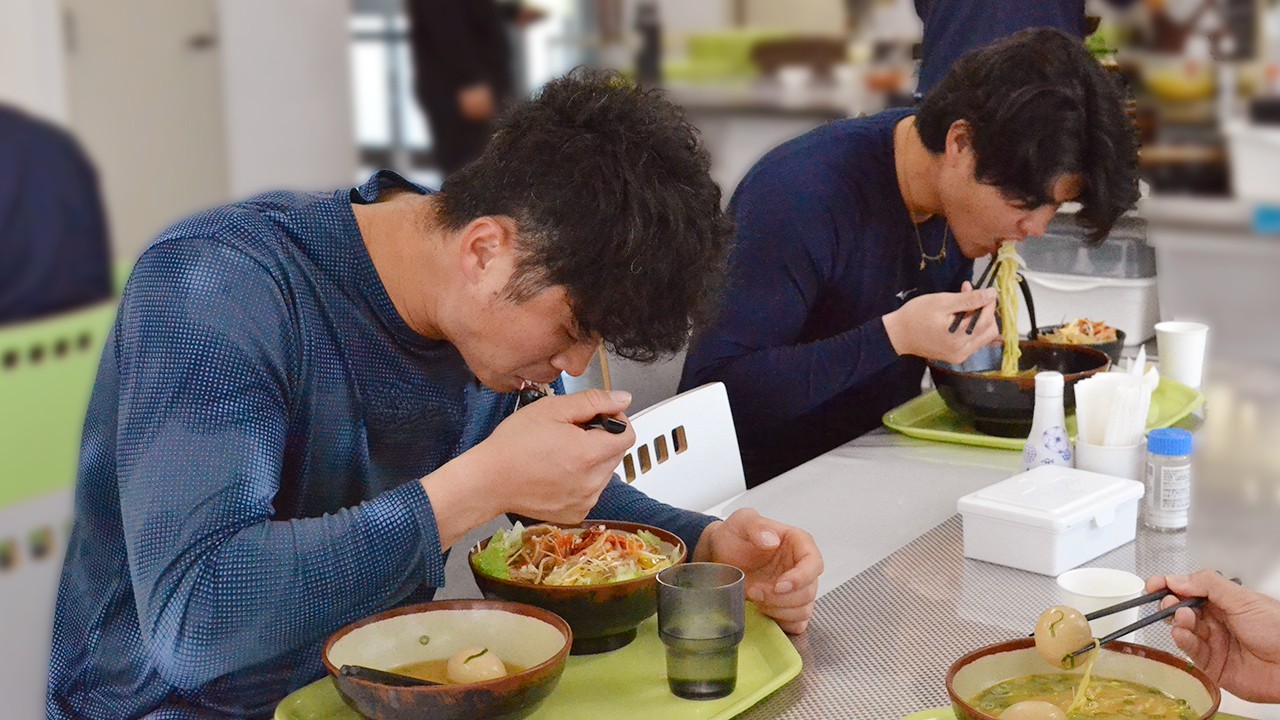 ENEOS野球部のクラブハウスを案内してくれたのは、ENEOS野球部主将の山田陸人選手です。クラブハウスには食堂があり、選手たちは朝食・昼食・夕食のすべての食事を食堂でとっています。そのため、この食堂は体づくりやコンディション管理の中心となる場所です。練習や試合のスケジュールに合わせて、決まった時間にしっかり食事がとれるように管理されています。献立は寮の管理人さんが中心となって考えていますが、バイキング形式のため選手一人ひとりの意識がとても重要です。関根智輝選手は自分の身体に合った栄養摂取を心掛け、食堂で食べる1日3食に加え、バナナやプロテインなどの間食を取り、1日5~6食は食べると話しています。 野球で高いパフォーマンスを発揮するために、食堂は非常に重要な場所となっています。