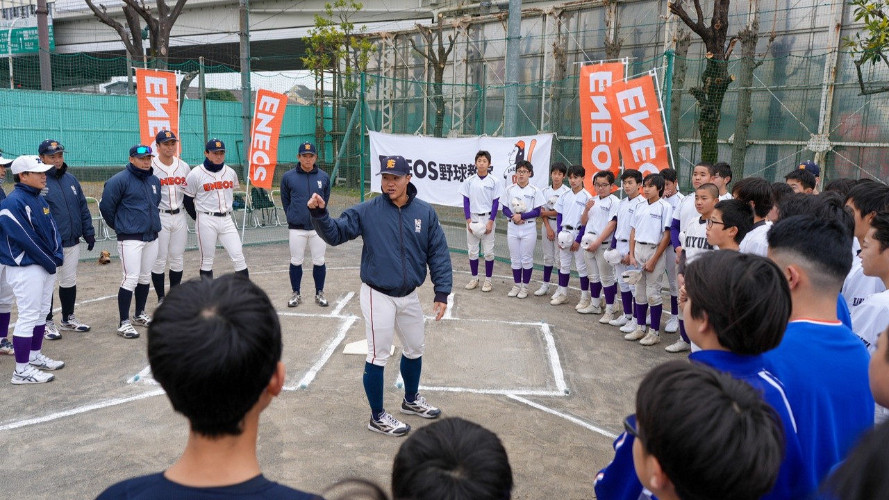 ENEOSグループはグループ行動基準の一つとして「市民社会の発展への貢献」を掲げています。ENEOS野球部はこの行動基準に基づき、「スポーツ・文化の振興」「次世代選手の育成」「地域社会への貢献」を目的に小学生・中学生・高校生を対象とした野球教室を毎年開催しています。野球教室ではENEOS野球部の現役選手が、野球の楽しさや魅力を伝えながら、基礎的な技術指導を行っています。今年度は、ENEOSグループの製油所や活動拠点を中心に全国11か所で実施しました。