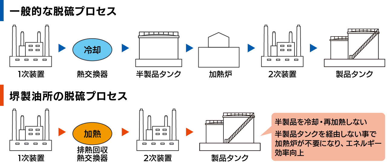 坂部さん:製造工程の途中で一時的に製品を保管する半製品タンクというものがあるのですが、堺製油所は他の製油所に比べその半製品タンクが少なく、装置間の熱融通を積極活用した製油所として建設されました。通常、石油製品を作る各装置は独立しており、製造工程において装置から装置へと製品を移す際には、一度冷却をして半製品タンクに溜め、再度加熱炉で加熱してから次の装置で処理することが一般的です。しかし、堺製油所は装置間の半製品タンクが少ないため、再加熱が不要となっています。さらには、各装置で発生した排熱を有効利用することで加熱炉の数も最小限に抑え、結果、燃料の大幅削減を実現しているのです。