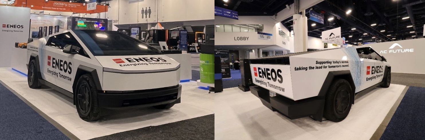 EV Fluidは、ENEOSが自動車用潤滑油の開発で培った豊富な経験を活かし、電気自動車(EV)およびハイブリッド車(HEV)の駆動システム向けに特別に設計・開発した革新的な潤滑油です。電気自動車(EV)に関連した展示を行っていることを分かりやすく表現するために、テスラ社のサイバートラックにENEOSオリジナルデザインのラッピングを施し、来場者の注目を集めました。