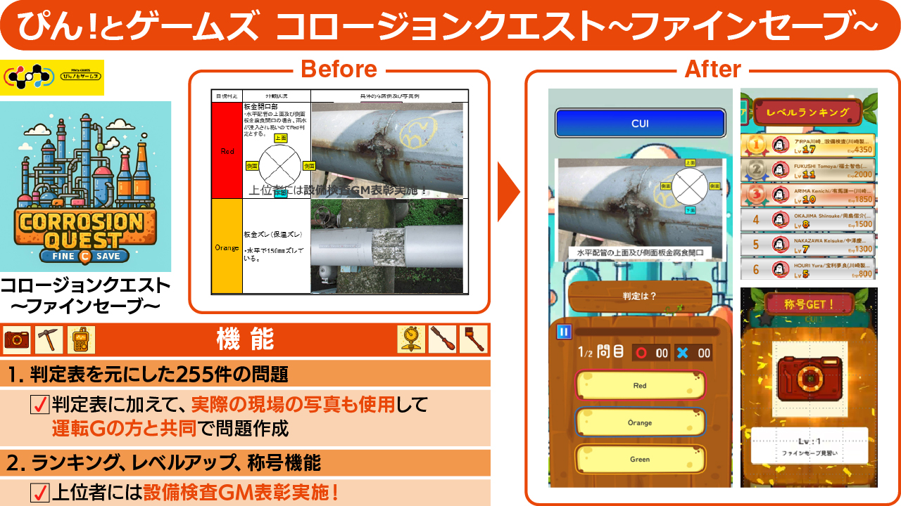 これらの課題に対し、川崎製油所では現場サイドから検査の品質向上を目指す運転員向け1次検査教育アプリ「ぴん!とゲームズ」を導入。本社では検査作業の効率化に向けた外面腐食管理アプリの導入を推進しています。