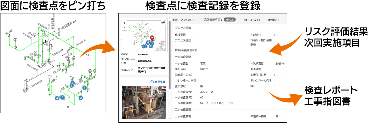 外面腐食の1次検査は従来、印刷した図面を現場に持参して検査結果をそれに記入、事務所に戻ってExcelやWordでレポートを作成するという煩雑な工程で行われていました。しかし、外面腐食管理アプリを活用すれば、現場でタブレットに直接入力してレポート作成まで一度に完了させることができます。入力された情報はクラウドで一元管理されるので、関係者同士でリアルタイムに情報を共有することも可能です。