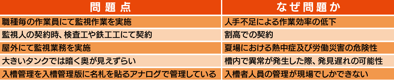 製油所では塔槽類等(タワーやタンクなど)の中で検査や補修などの作業を行っています。その際に、安全管理のために塔槽類等の外側から「監視人」が常時、作業を見守っています。水島製油所ではタンク槽内作業に任意の監視人を配置してきましたが、近年、複数の課題が顕在化していました。第一に、人手不足で十分な監視人の確保が困難なことです。また、猛暑が続けば、熱中症や労働災害のリスクも高まります。さらに、大きなタンクの場合、奥の方が暗くて見通しが悪く、作業状況の把握が難しいという問題もありました。