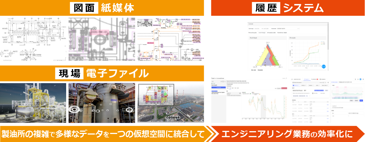 デジタルツイン基盤は、製油所で日々生まれる膨大な情報を一つにまとめ、誰でも直感的に使えるようにしたシステムです。製油所の図面や日々の操業データ、設計情報など、製油所に関する全ての情報が一元的に集約されています。