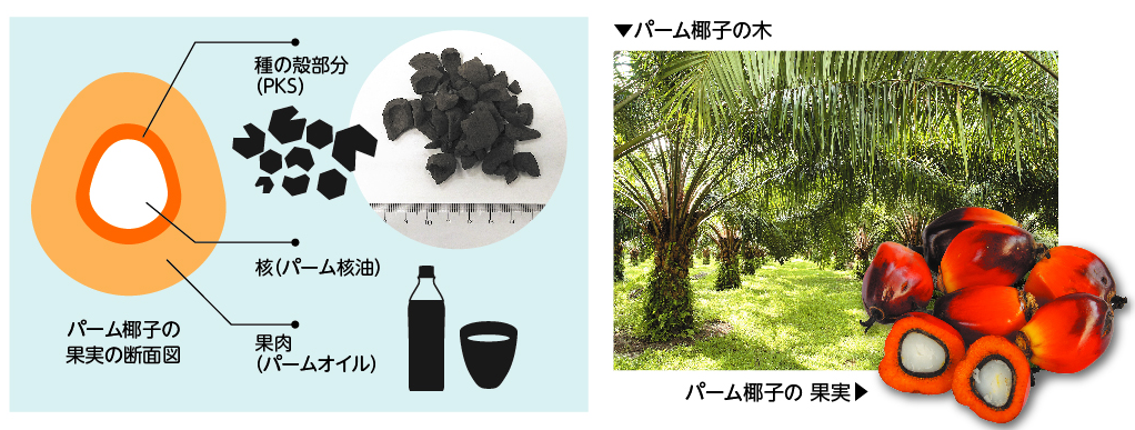 パーム椰子とは、東南アジアなどの暖かい地域で育つ椰子の木の一種であり、その木の実の殻のことをパーム椰子殻と言います。パーム椰子からとれるパーム油は、チョコレートや石鹸など、私たちの身の回りの様々な製品に使われています。パーム椰子殻は、以前はそのまま捨てられていましたが、硬く、乾燥しているという性質から、他のバイオマス燃料よりも少量で多くの熱を生み出せる重要な資源になりました。