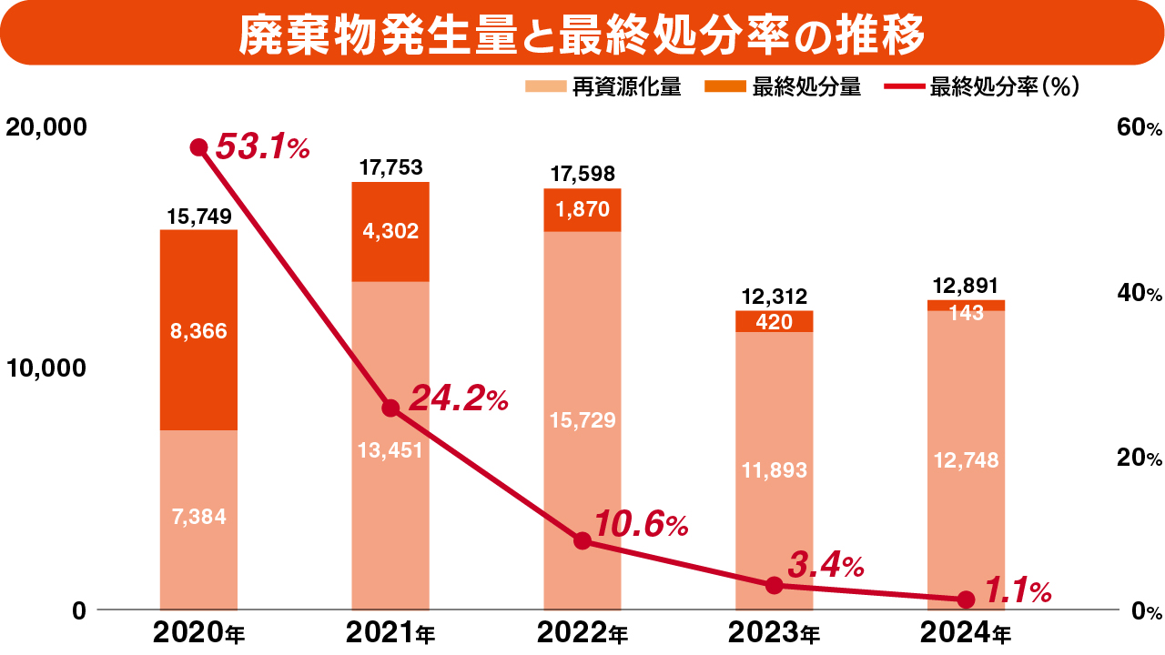室蘭バイオマス発電所で発生する産業廃棄物の9割以上は、燃料を焼却した際に発生する燃焼灰です。運転を開始した当初は燃焼灰を再資源化する処分会社が少なく、処分会社の受入が難しい場合には埋立処分をするしかありませんでした。また、処分会社へ燃焼灰を運搬する貨物列車の運休時にも埋立処分を余儀なくされ、発電所の運転開始当初は、埋立処分率(最終処分率)が50%を超過していました。