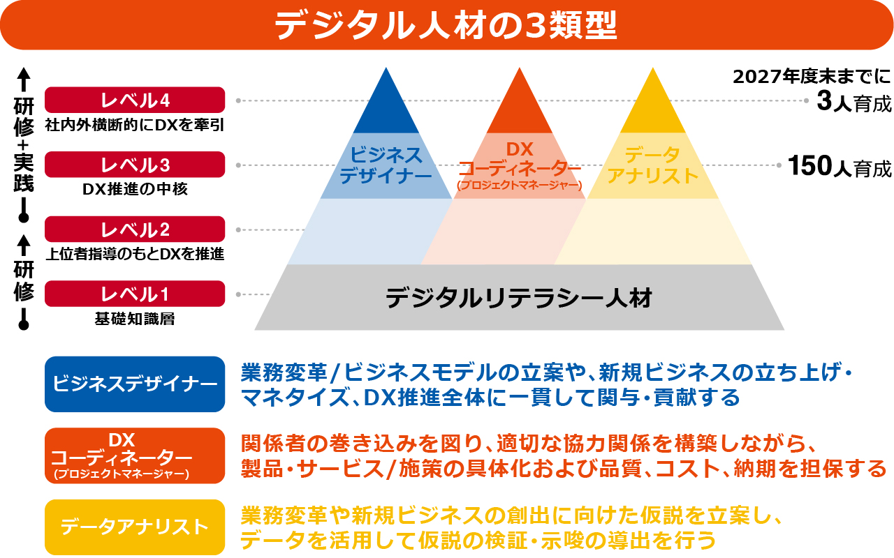 田中 データ分析もそうですが、事業を進めていく上でどのようなデジタル技術が適しているかを学べる人材、実際に適したデジタル技術を選択して導入できる人材をきちんと育てていかなければならないと考え、2023年度に3つのレベルでの認定制度を立ち上げました。まずはeラーニングを活用して全社員をレベル1まで引き上げ、その中から研修を受講した人がレベル2、一定の実務をこなした人がレベル3といったプログラムによる認定を行って、「レベル2以上の高度デジタル人材を全社員の20%に相当する1500人育成する」という目標を当初予定より1年以上前倒しで達成しました。