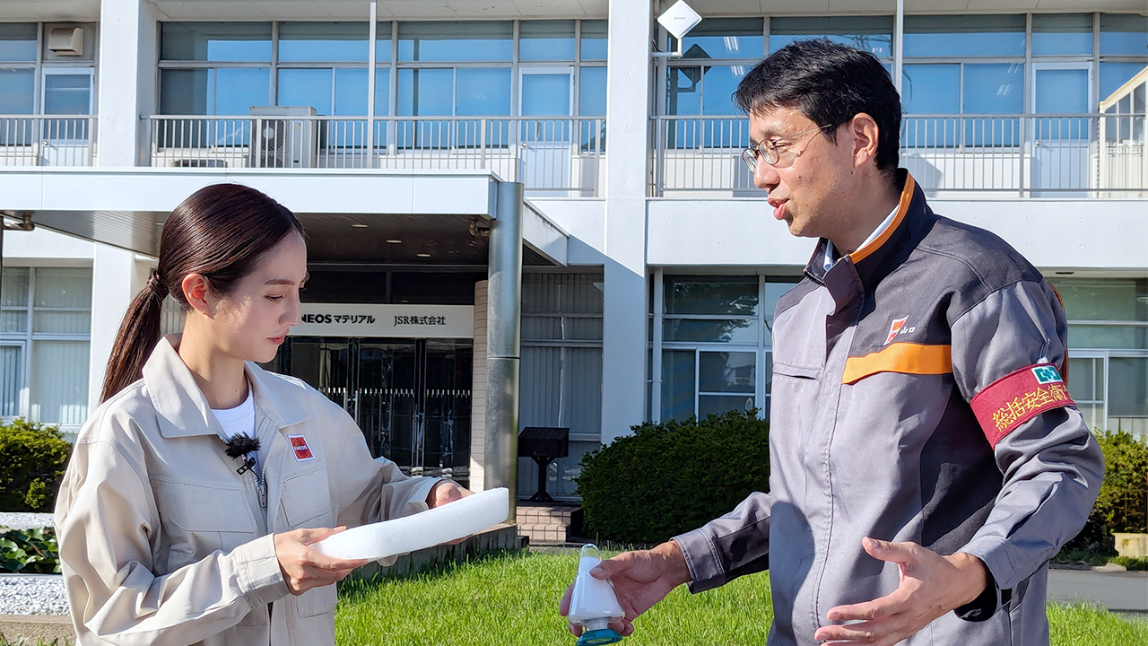当社協賛ラジオ番組「ENEOS FOR OUR EARTH -ONE BY ONE-」(毎週土曜14:00-14:30にJ-WAVEにて放送)でナビゲーターを務める堀田茜さんが、千葉県市原市の「ENEOSマテリアル千葉工場」を訪れ、どんな事業を行っているのか取材しました。ENEOSマテリアルは、ENEOSグループの素材事業の中核を担う事業会社で、合成ゴムや機能性材料の研究開発・製造・販売をグローバルに行っています。