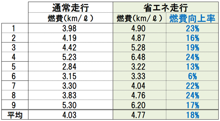 今回の講習会に参加したタンクローリー乗務員9名のデータがこちらです。エコドライブを実践することで、受講前と比較して全員に明らかな燃費向上が見られました。