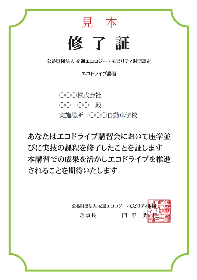 講習会終了後、公益財団法人交通エコロジー・モビリティ財団認定エコドライブ講習の修了証が受講者へ授与されました。