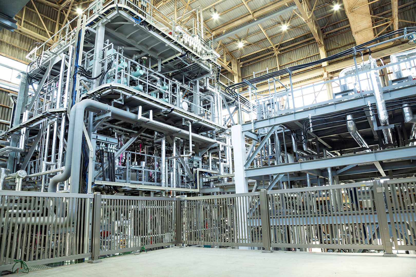 ENEOSはNEDO(国立研究開発法人新エネルギー・産業技術総合開発機構)の「グリーンイノベーション基金」の支援の下、2022年度よりスケールアップ実証に着手、2024年6月には1日当たり1バレル(約159リットル)の製造能力を持つ実証プラントを中央技術研究所内に完成させ、同年9月より実証運転を続けています。このプラントは、水素の製造からCO2供給、それらを原料とした逆シフト反応による合成ガスの製造、さらにその合成ガスを原料としたフィッシャー・トロプシュ(FT合成)反応による合成粗油(人工的な原油)の製造、そしてアップグレーディング(製品化工程)までを一貫して合成燃料を製造できる国内初の設備です。原料に用いる水素は再エネ電力を用いた水の電気分解によって製造しており、これも合成燃料の製造においては国内初の取り組みです。CO2は工場の排気から回収するほか、DAC(Direct Air Capture)設備によって大気中から直接回収したものを使用しています。